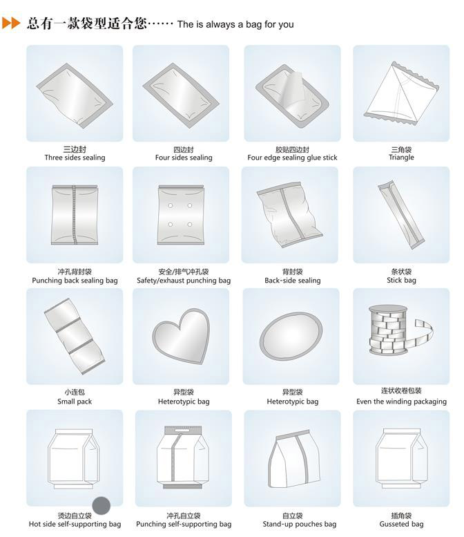 8、包装的款式多样化,背封、插角、四边烫、四边封、站立袋、连袋、冲孔等。